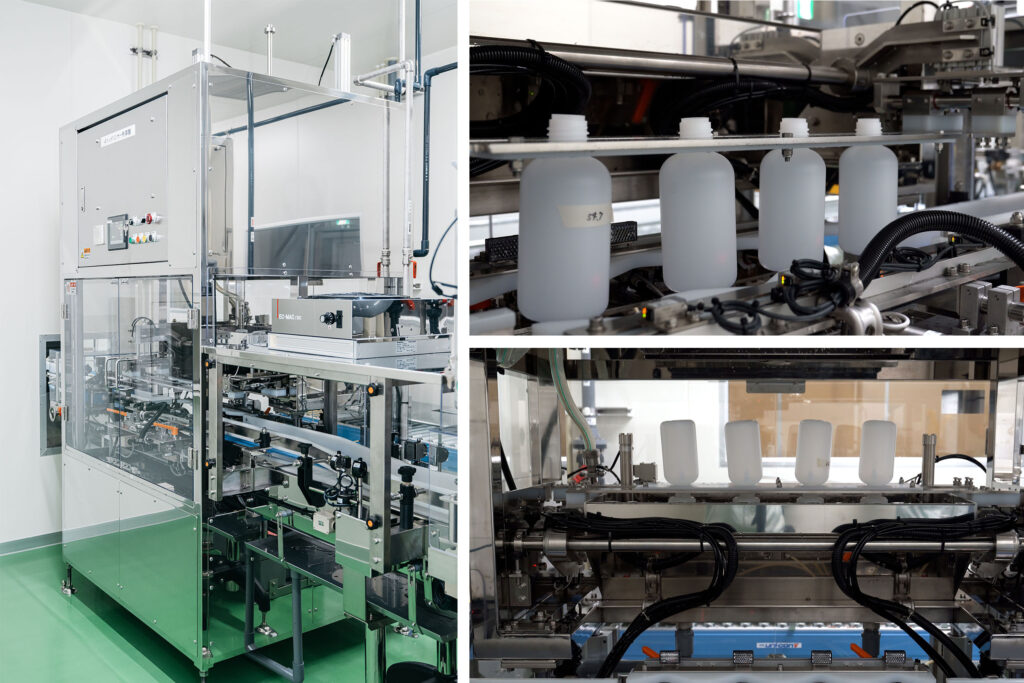 整列した容器をグリップし反転させ、容器の内面及び外面を洗浄します。